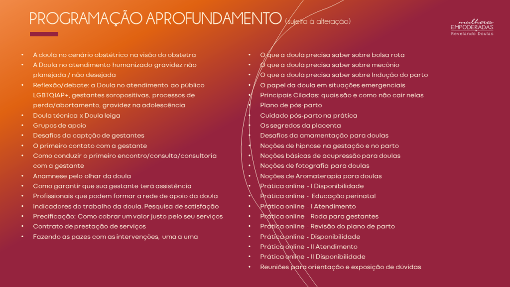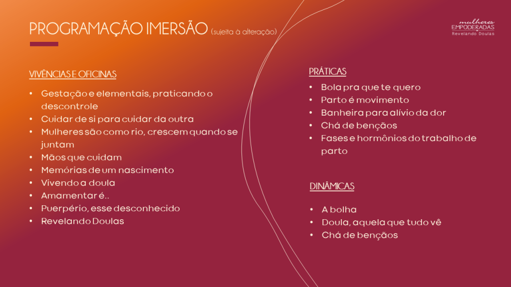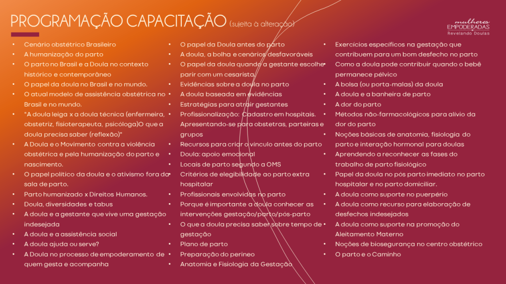 Pensada para ser uma experiência única com práticas, dinâmicas, vivências e muita troca para que você se sinta cada vez mais capaz, segura e confiante para prestar suporte às mulheres que confiarem em você.
